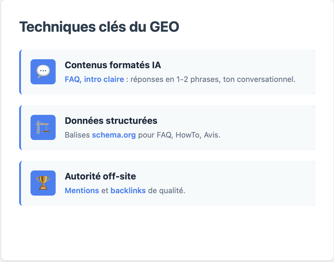 Pour réussir en GEO, plusieurs leviers techniques et éditoriaux doivent être mobilisés